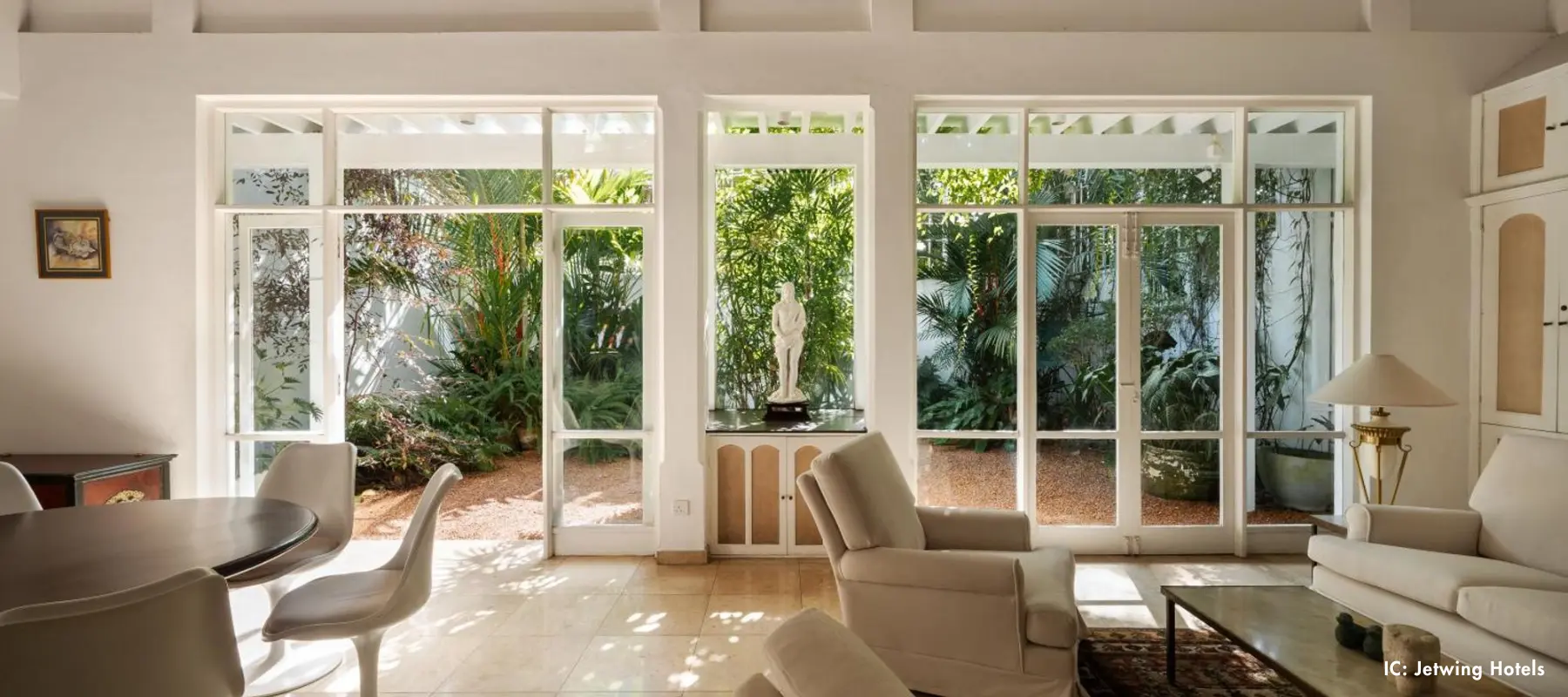 The result is a property that feels less like a hotel than a well-kept family home. The double-height main salon, flanked by courtyards on two sides, sets the tone: unhurried, quietly elegant, and rooted in Bawa’s signature tropical-modern sensibility.