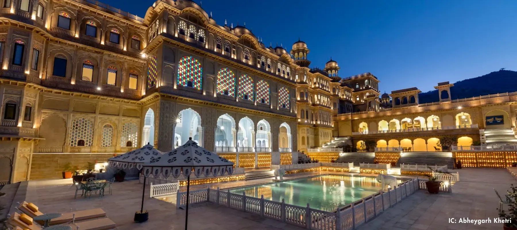 Inside, the aesthetic holds its ground. Plush interiors carry the visual language of Rajput architecture without tipping into pastiche, while spa services, a swimming pool, and multi-cuisine dining ensure the comforts are entirely contemporary. Curated evenings of folk music and dance add a layer of cultural depth that feels considered rather than decorative.