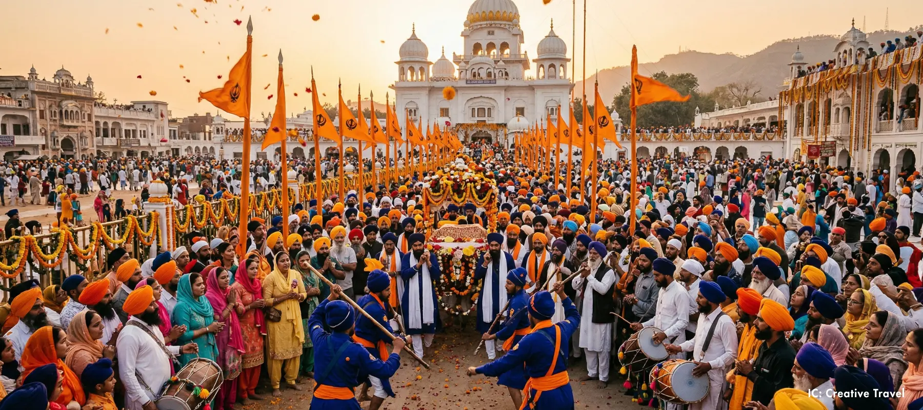 At the Golden Temple in Amritsar, the day begins before dawn. Special prayers, unbroken scripture readings, and kirtan fill the air as thousands of devotees gather in the glow of the sacred complex. Nagar kirtan processions move through the streets, with floats, saffron flags, and displays of gatka martial arts drawing crowds at every turn.