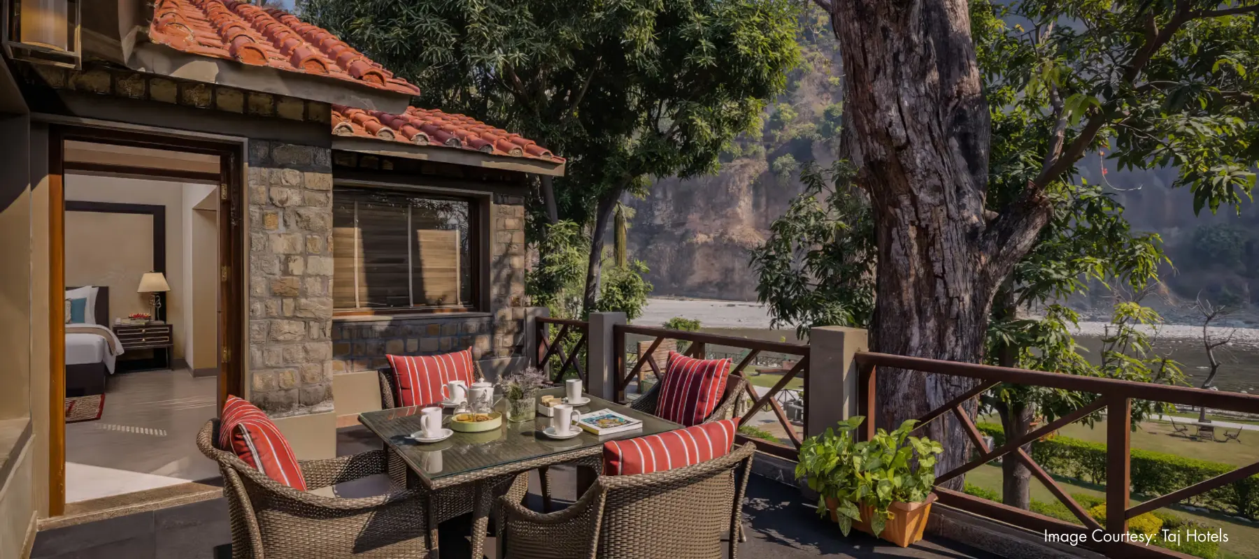 Taj Corbett Resort & Spa in Uttarakhand offers a nature-led retreat along the Kosi River, bordering Jim Corbett National Park. Designed with stone, wood and earthy textures, the low-rise property integrates seamlessly into its forest surroundings, emphasising quiet, immersive luxury.